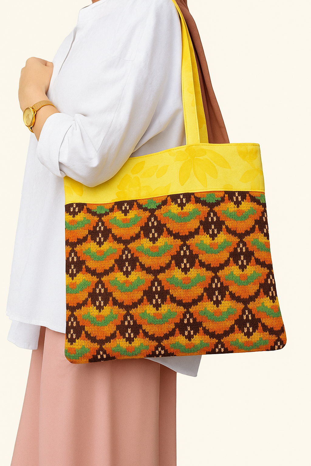 This embroidered cloth tote blends tradition with trend โ
